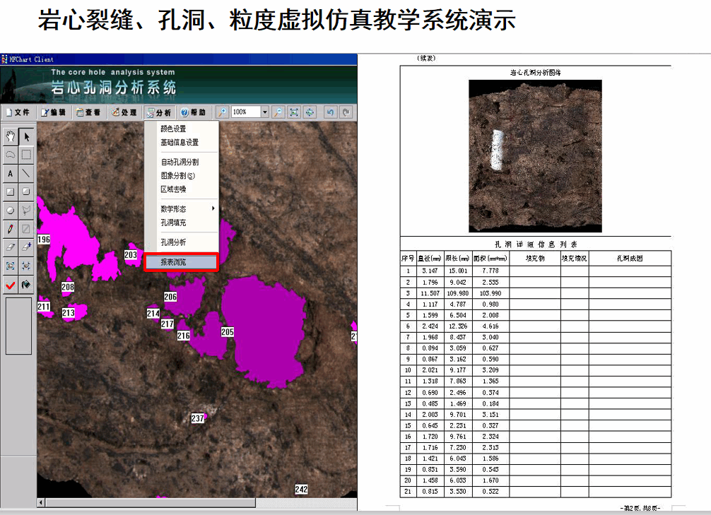 傳統(tǒng)實(shí)驗(yàn)由老師手持巖心實(shí)物、指導(dǎo)學(xué)生觀察、描述巖心。由于巖心實(shí)物匱乏,教學(xué)素材極其有限。通過虛擬仿真技術(shù),可以通過各大油田巖心庫收集國內(nèi)外巖心實(shí)物的數(shù)字圖像,結(jié)合計(jì)算機(jī)技術(shù)實(shí)現(xiàn)巖心孔洞、裂縫、粒度虛的擬仿真教學(xué)。通過數(shù)字圖像處理技術(shù)對巖心圖像進(jìn)行預(yù)處理,快速確定裂縫的邊界,達(dá)到巖心圖像處理和人機(jī)交互方式。研究巖心孔洞、裂縫、粒度圖像分析技術(shù),實(shí)現(xiàn)了自動提取孔洞、裂縫、粒度目標(biāo),自動統(tǒng)計(jì)計(jì)算相關(guān)參數(shù),并結(jié)合試驗(yàn)室常規(guī)物性測試和測井資料進(jìn)行參數(shù)分析評價,從而解決了以往人工測定,測量數(shù)值存在較大誤差,而且費(fèi)工費(fèi)時,轉(zhuǎn)化參數(shù)難度大等問題,深化了對巖心這一地質(zhì)基礎(chǔ)資料的應(yīng)用,對于裂縫、孔洞型油氣藏的勘探與開發(fā)具有重要意義。